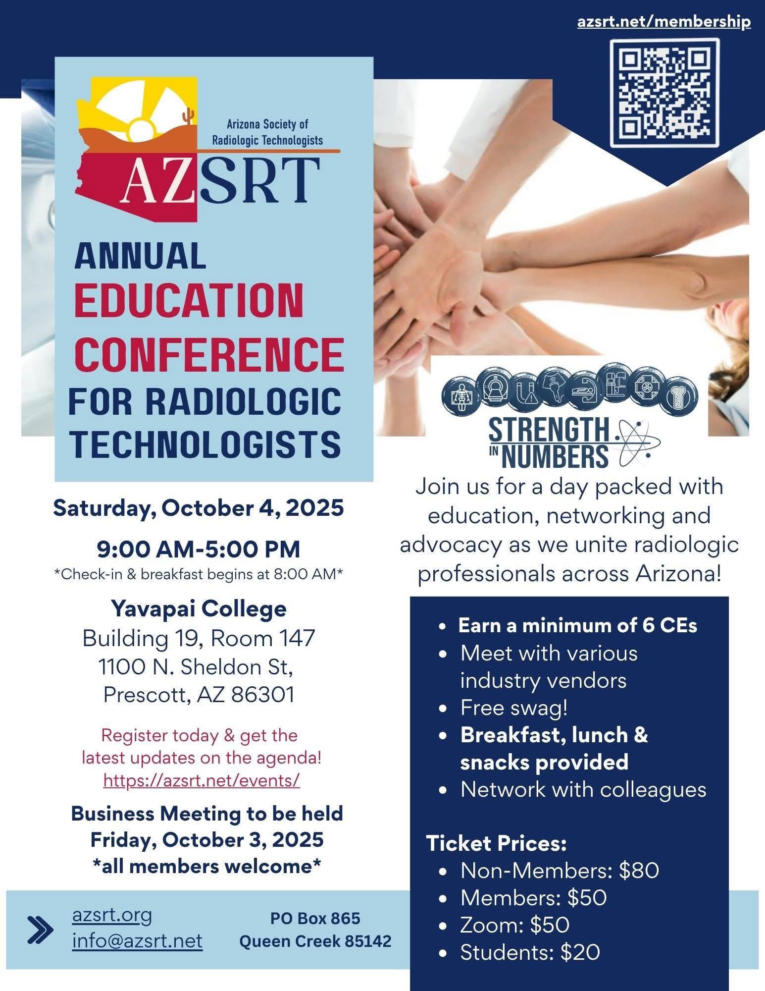 Join the Arizona Society of Radiologic Technologists for our Annual Education Conference – a full day dedicated to education, professional growth, and advocacy. This year’s theme, “Strength in Numbers,” reflects our ongoing commitment to uniting and empowering Arizona’s radiologic science professionals.